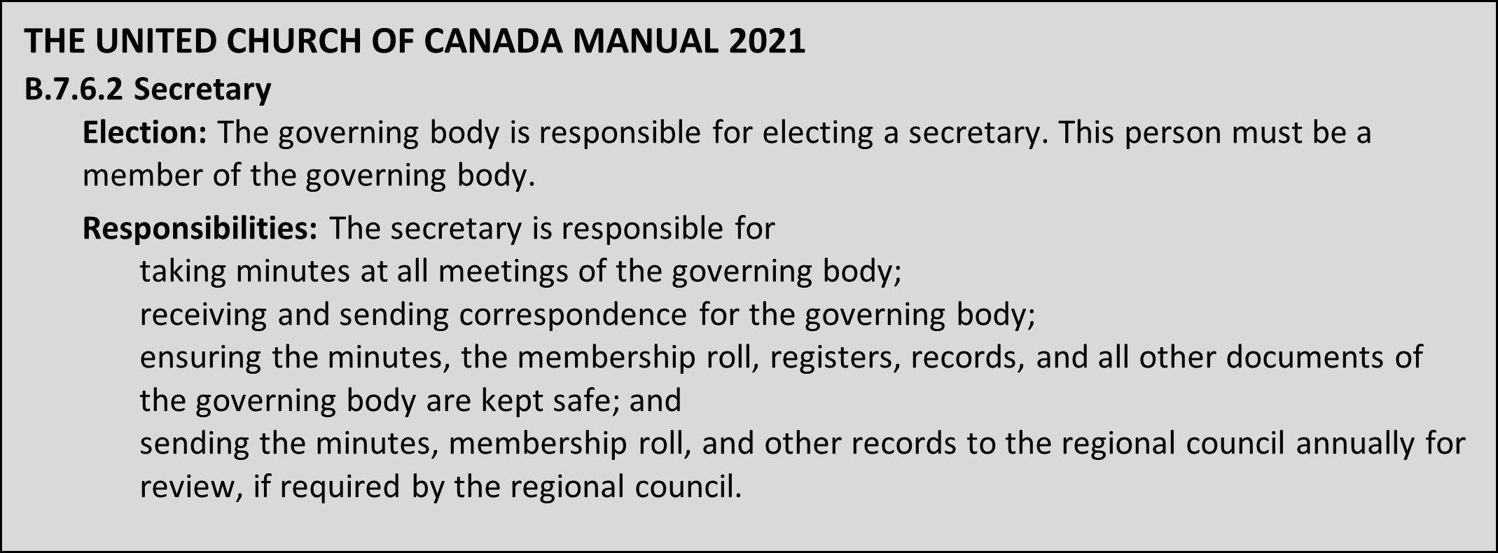 Duties: Is responsible for: taking minutes at all meetings of the congregation or pastoral charge and distributing said meeting minutes as required; taking minutes at all meetings of the Church Council and distributing said meeting minutes as required; receiving and sending correspondence on behalf of the Church Council; ensuring the minutes, the membership roll, registers, records, and all other documents of the Church Council are up to date, and kept safe; ensuring the signed minutes are posted on the church website, as per United Church of Canada mandate; and sending the minutes, membership roll, and other records to the Regional Council annually for review, if required by the Regional Council. Fulfills all other responsibilities as set out in THE MANUAL, 2021 section B.7.6.2.